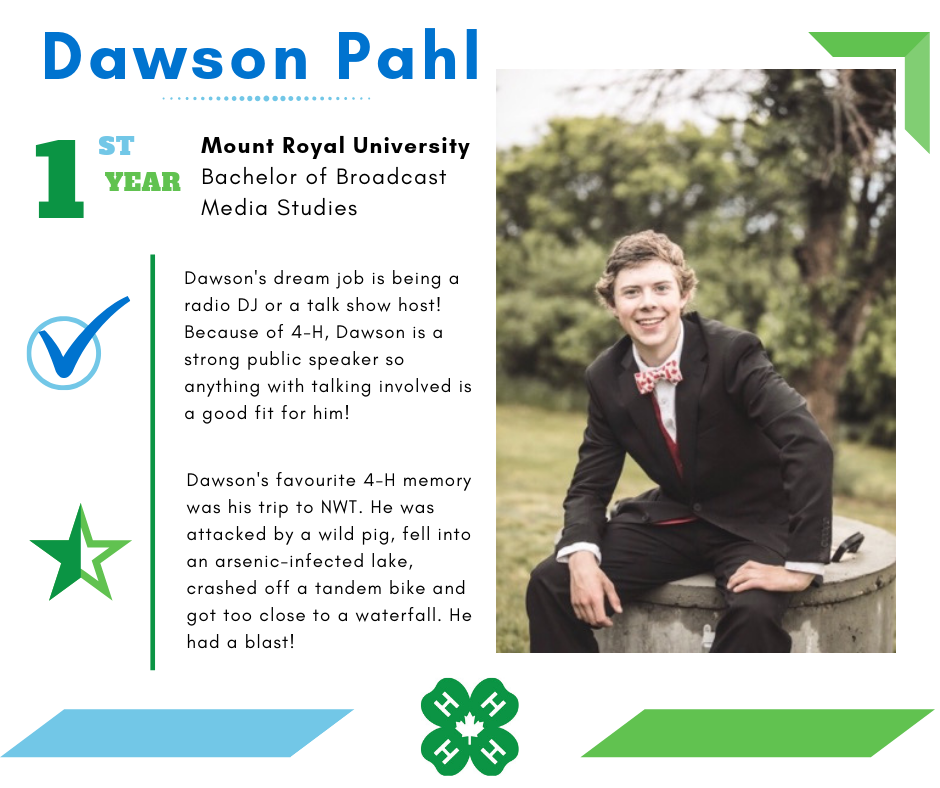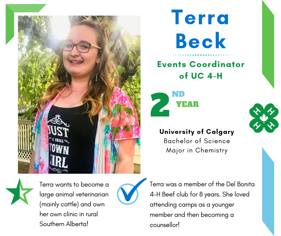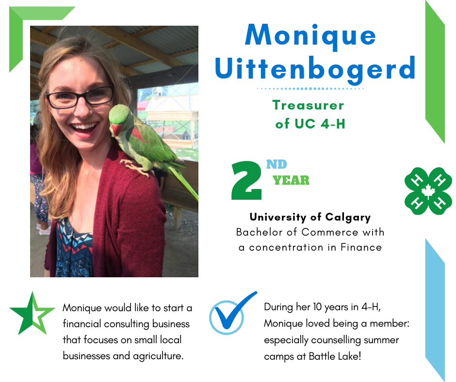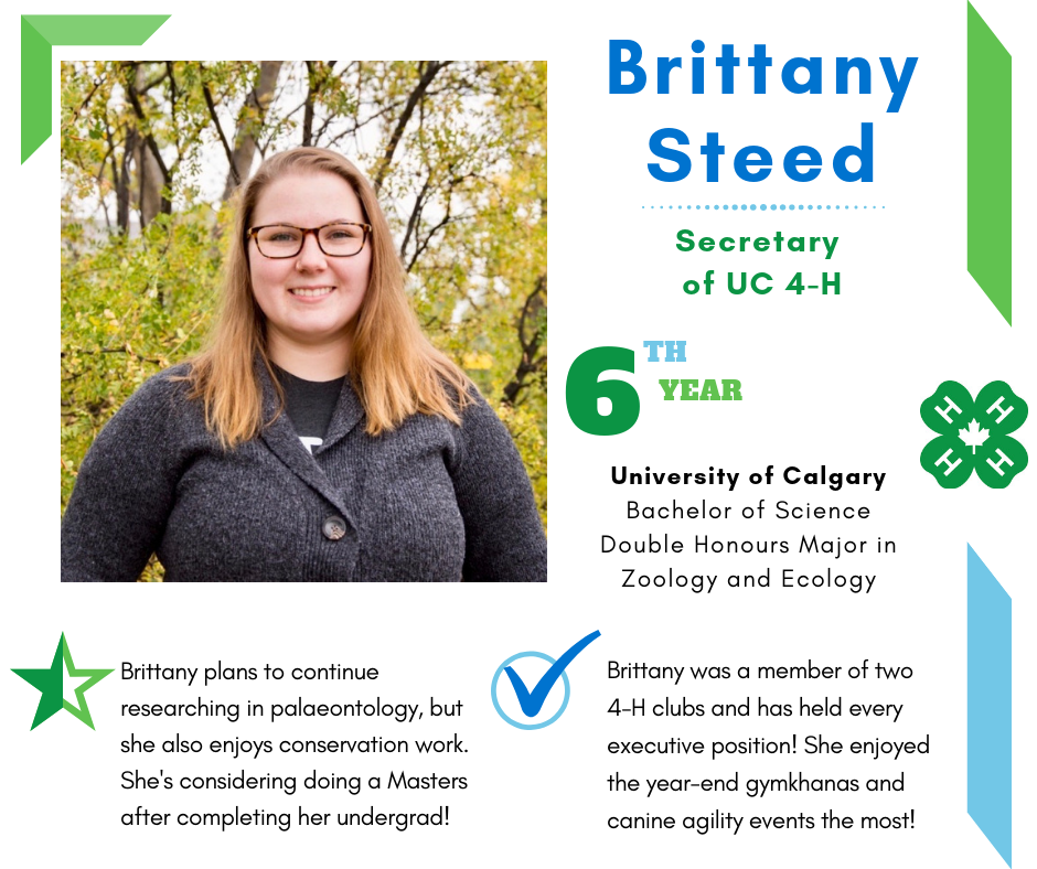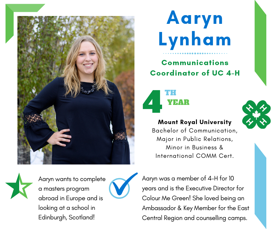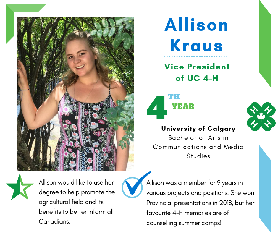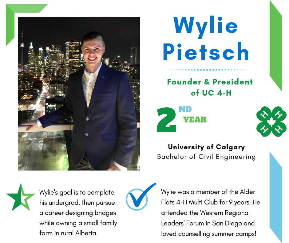 Founded in 2017, University of Calgary 4-H is a group of 4-H Alberta alumni who are pursuing post-secondary education in Calgary. Members volunteer their expertise to Calgary Region clubs by providing communications workshops and judges. UC 4-H offers grant opportunities to 4-H Alberta clubs that support varied initiatives, impacting members. Follow @ucalgary4h across social media.